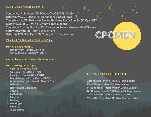 MEN'S ADVANCE is an annual off-campus, weekend trip for men. It’s a time of worship, refreshment, encouragement, & discipleship. This is intended to be an intentional time with God and brothers in Christ. Previous trips to the Ocoee Retreat Center, Five Star Retreat, & Gulf Shores involved great worship, groups, and recreational activities such as white water rafting, side by side off road tours, or deep sea fishing.