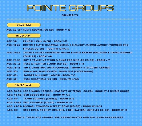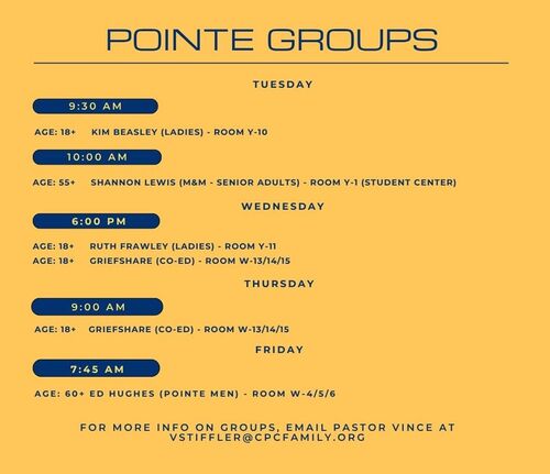 We have Groups meeting in person every Sunday. We also have some groups that meet throughout the week. Please also feel free to reach out to the Group Leader or with our Adult Ministries Pastor Vince Stiffler if you have any questions regarding Pointe Groups or a meeting location.